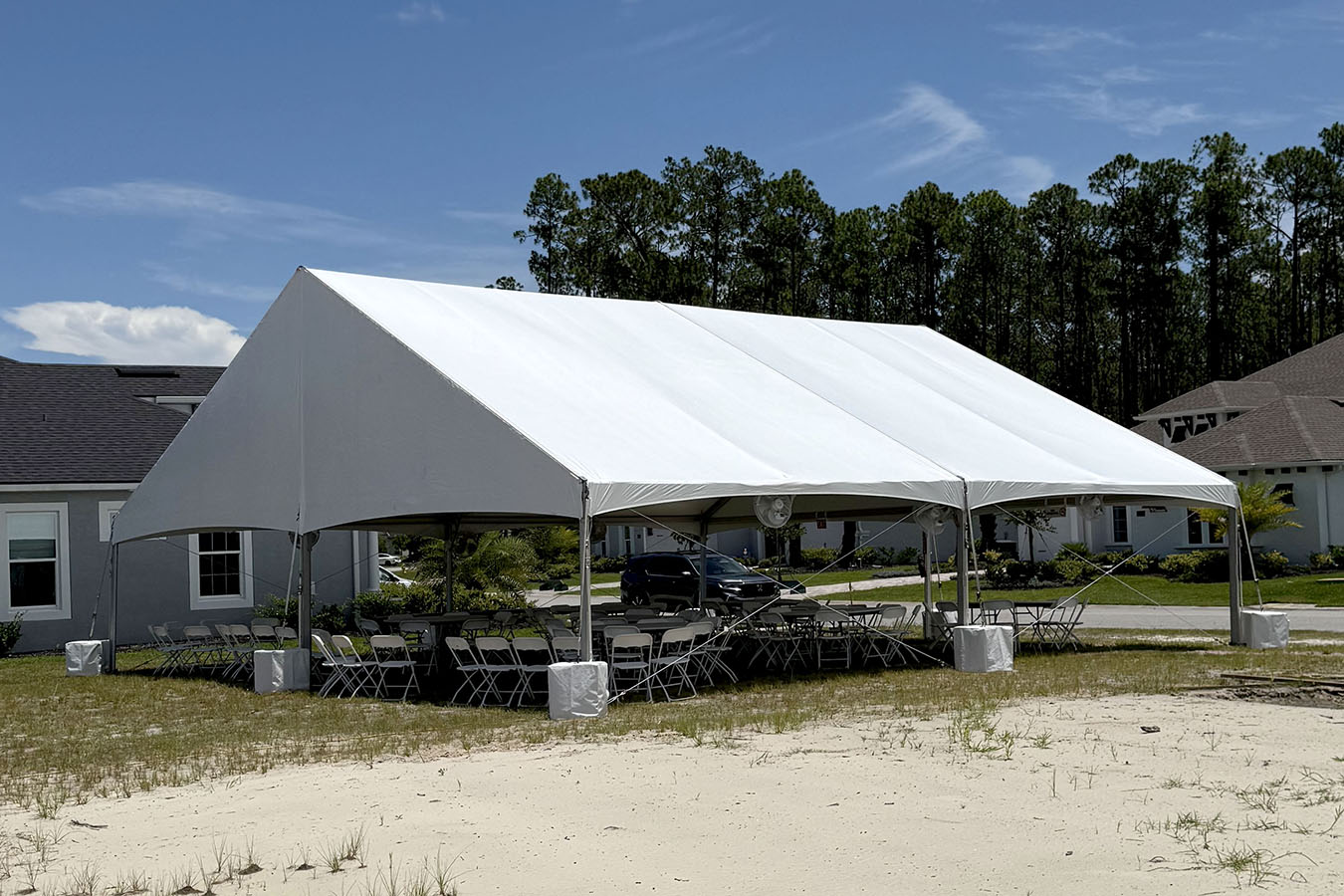 The Jumbotrac Frame Tent is a popular tent rental choice for weddings, parties, festivals, corporate events, and more. This free-standing structure uses only perimeter poles with no interior center poles, creating a spacious, unobstructed interior that allows for flexible layouts, including seating, staging, dance floors, and more.